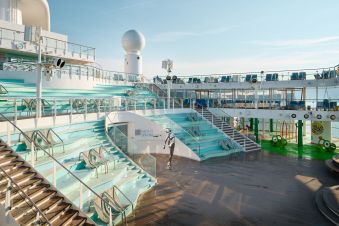 Отпуснете се на шезлонгите около басейните на откритата палуба или посетете пързалките на аквапарка.