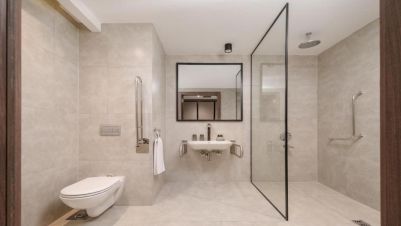 - Голям самостоятелен душ тип тропически дъжд и тоалетна