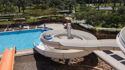 Desert Rose 5* разполага със собствен девствен пясъчен плаж с дължина от 1км, с 40 000 м² природна лагуна със златист пясък. Хотелът предлага на своите клиенти идеална атмосфера за забавления или просто да се насладят на прекрасния ненадминат климат на Червено море. Хотелът разполага с 4 плувни басейна, 1 с олимпийски размери, голям плувен басейн с палуби за слънчеви бани и бар край него, отопляем семеен плувен басейн и детски плувен басейн, специализиран за бебета и малки деца със собствен мини душ и мини столове. Като допълнение Аквапаркът предлага още и 6 водни пързалки.