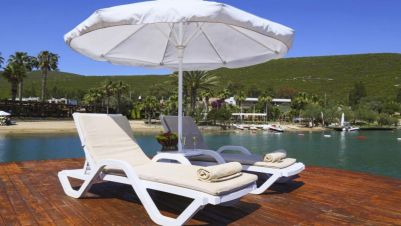 Собствен, пясъчно-чакълест със син флаг. Чадъри, шезлонги, матраци на плажа и при басейна – безплатно. Плажни кърпи - срещу депозит.