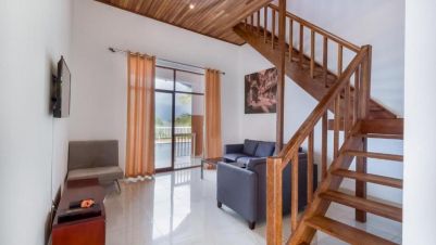 Дуплекс стая с изглед към басейна – 80 м2, максимално настаняване 2 възрастни: голяма спалня, кът за сядане, кухненски бокс снабден с микровълнова фурна, електрическа кана, частен басейн и балкон.