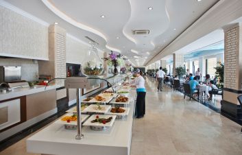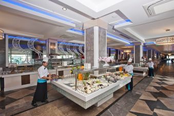 Хотелският комплекс има 5 ресторанта, от които италиански и турски. Част от заведенията са и няколко бара - витаминен бар, бар край басейна, градински бар, плажен бар, и други.
